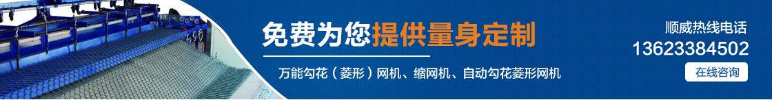 安平縣順威絲網(wǎng)機械設(shè)備制造有限公司自產(chǎn)自銷,省去中間環(huán)節(jié),讓利給客戶,真正的讓您省錢。主要產(chǎn)品有:萬能勾花(菱形)網(wǎng)機、縮網(wǎng)機、自動勾花菱形網(wǎng)機、全自動勾花菱形網(wǎng)機。 |